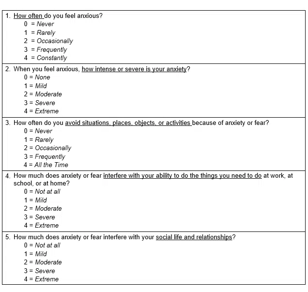 The Overall Anxiety Severity and Impairment Scale (“OASIS”) is a brief continuous measure of overall anxiety severity and impairment. The OASIS can be used across anxiety disorders, with multiple anxiety disorders, and with sub-threshold anxiety symptoms. This instrument is 5 questions long and well validated in multiple settings and populations.